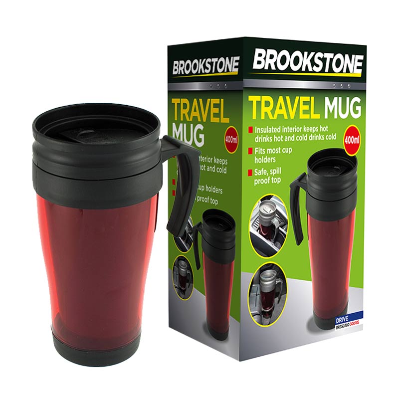 The Brookstone Insulated Travel Mug has an insulated interior that keeps drinks hot or cold