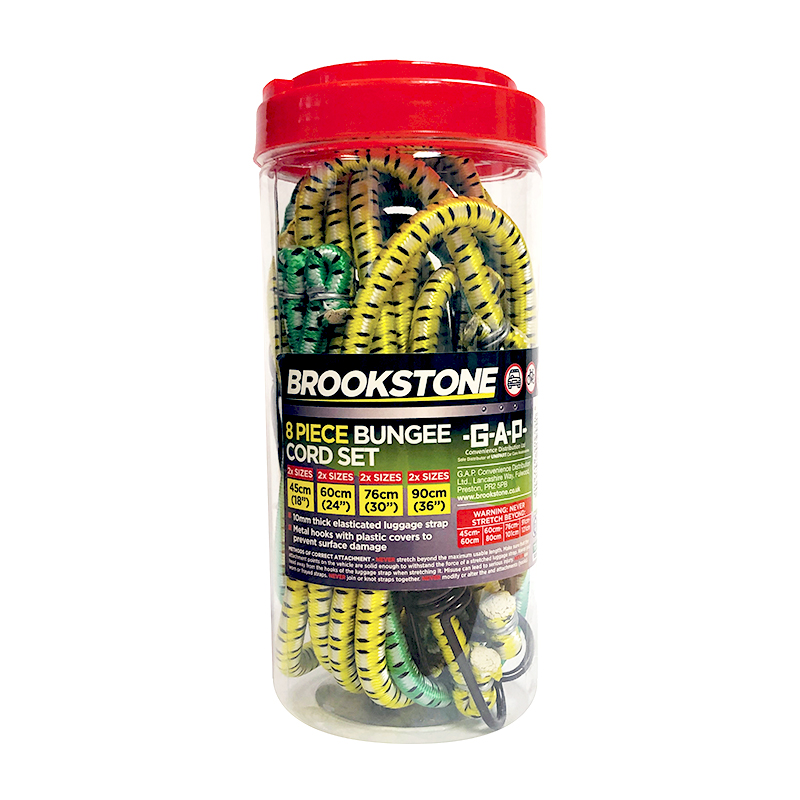 8 Piece 10mm thick elasticated luggage strap that includes metal hooks with plastic covers to prevent surface damage.