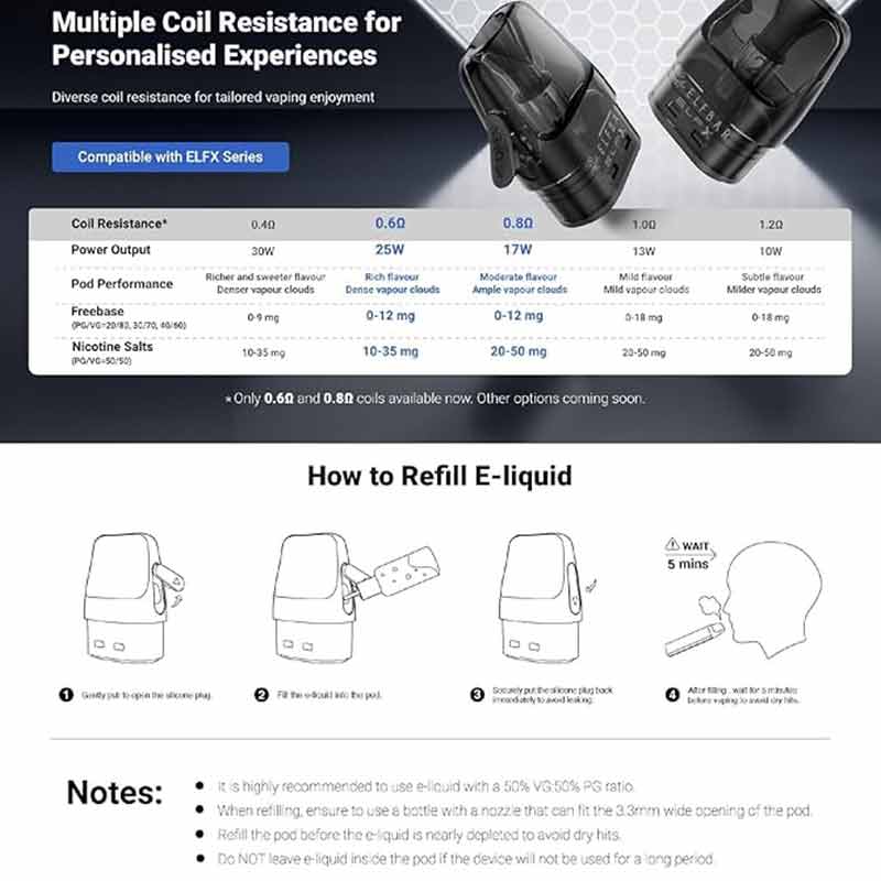 To refill, simply lift the silicone stopper located at the top of each Elf Bar ELFX Pod and fill with your preferred e-liquid. We recommend 20mg Nic Salts and Freebase 50VG/50PG e-liquids with the 0.8ohm pod, and higher VG e-liquids with the 0.6ohm pod. Once filled, the pod magnetically connects to the device.