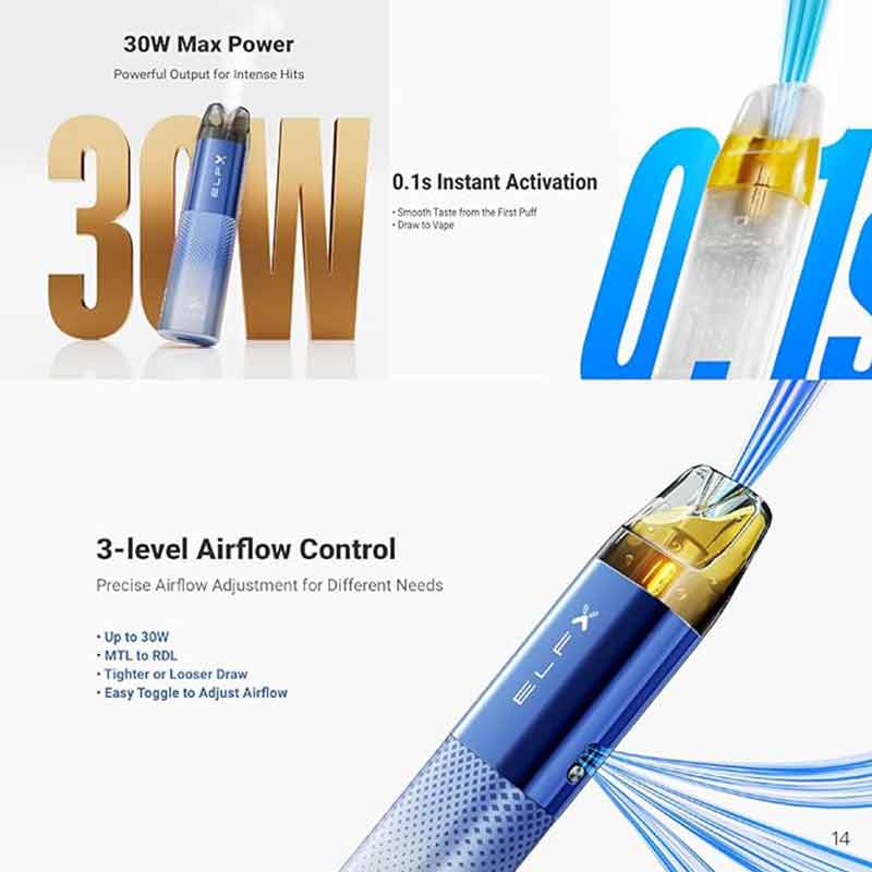 The ELFX pod kit offers quick recharge capabilities via a USB-C connection sold separately, a buttonless interface, and an auto-draw mode that activates the device instantaneously when inhaling, making it perfect for novices or those looking for hassle-free vaping. The ELFX also incorporates an airflow control slider on the side, which allows for exact modification of the draw to suit your individual taste.