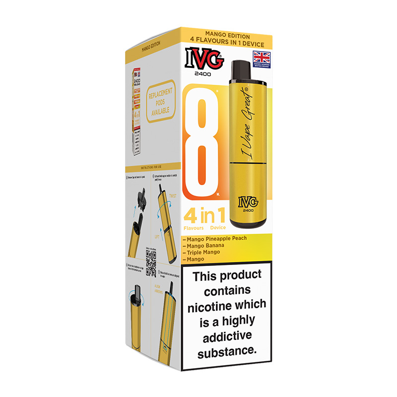 The IVG 2400 4in1 Rechargeable – Mango Edition offers a vibrant, tropical mango flavour that delivers a satisfying vaping experience. Designed for convenience, it features a sleek, portable design, making it easy to carry and use on the go. With a high nicotine strength, it caters to those seeking a robust hit. Enjoy the simplicity of vaping with this fruity delight!