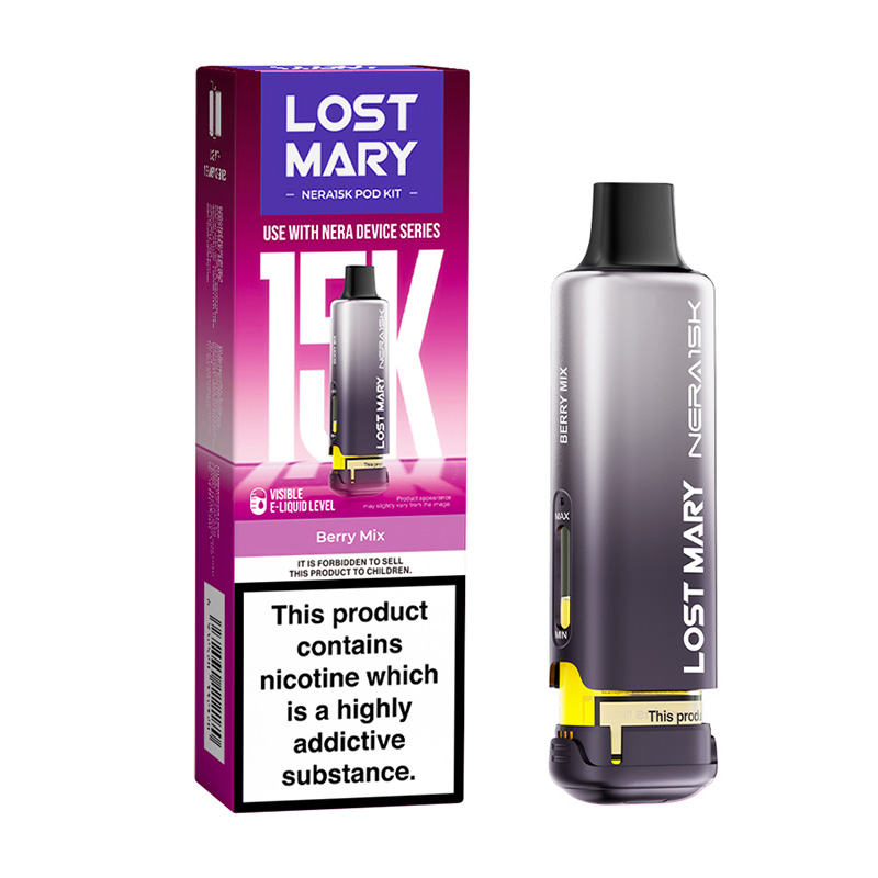 NERA15K Refill Pack with a 2ml prefilled pod and 10ml refill bottle. Designed for use with the Lost Mary NERA15K Kit. Easy to use, no pod refilling required.